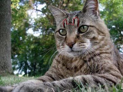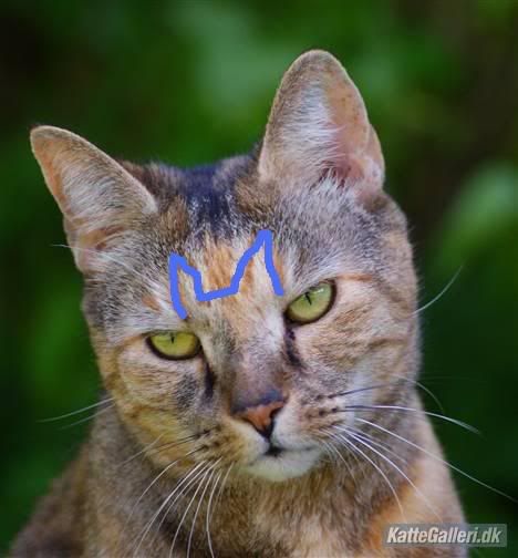 senere har jeg lært, at det er tydelig M på de fleste tabbykatte, men også fuldmaskede katte kan have det.