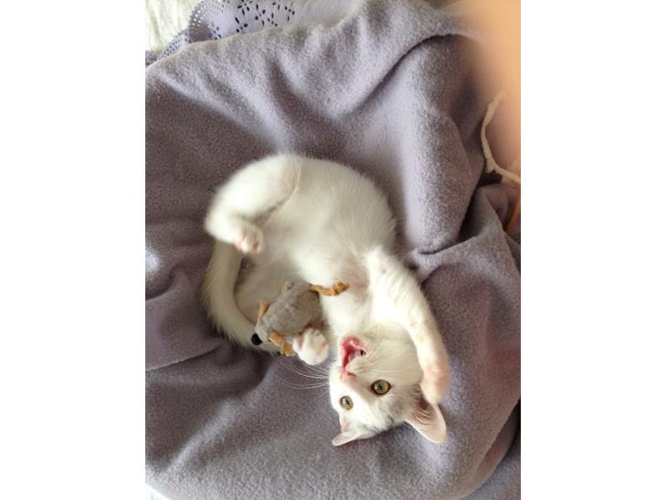 Robin er en moderløs huskat killing .Han dykkede op i min have.Han var meget tynd og rigtig sylten.Jeg tog imod ham og han er nu en glad og legesyg lille trold.Men der er en stor problem-Desmond er rasende!Håber,han vil acceptere Robin til sidst-ellers,jeg ved de ikke,hvad jeg skal gøre...