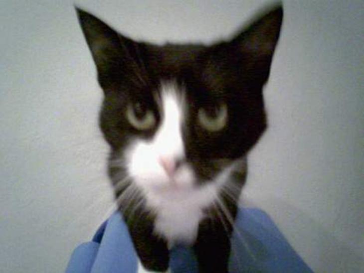 Sort, med en lille hvid plet på næsen, og hvis man satte hende sammen med hendes søster havde de hele den hvide plet som deres far havde, så de havde en halv plet hver. HAHA, sejt! :) Hun var min ynlings kat. Men nu er hun død.. :( hun blev vidst kørt over, og så døde hun i armene på min mor!! :( Savner hende SÅÅ meget!