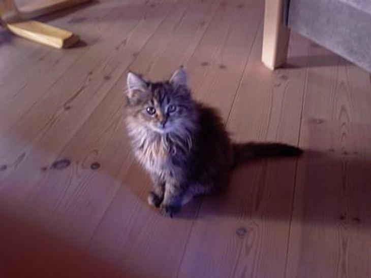 En mørk 1 år gammel Hunkat. Halv norsk skovkat med de smukkeste brune øjne. huner en meget kærlig kat som er så dejlig at putte sammen med men også at lege med ude i haven. hun spinner altid og smiler nærmest. Hun er en lille kat med med en gd bygnin og gode rubuste knogler men dog ikke stor og voldom. hun har en dejlig blod flot pels, som jeg elsker at sidder og børste endnu blødere. hun hars selvfølgelif det flotte strittende pels på kinderm hale og øre. Hun er smuk!