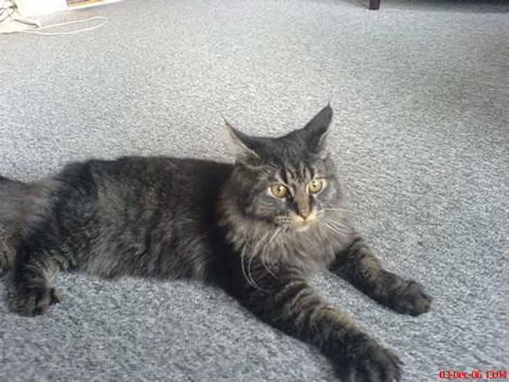 Han er sort over ryggen og på halen. og under mavsen er han grå/brun stribet... Hvide og sorte aftegninger i hovedet med M i panden...Meget meget smuk kat, som er det dejligste på jorden... Er meget kælen, og elsker at sove i vores seng sammen med os om natten... Tager dog nogle ture sammen med sin far, hvor de slåser lidt, men de bliver altid gode igen...
