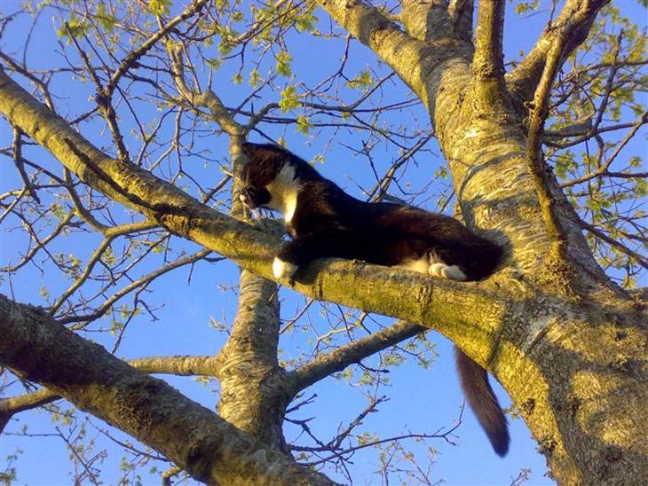 Elsker at klatre i træerne i haven - kan dog have sine problemer med at komme ned igen.. Vogter sine sine små killinger med næb og klør.. Eller.. bare klør :o)