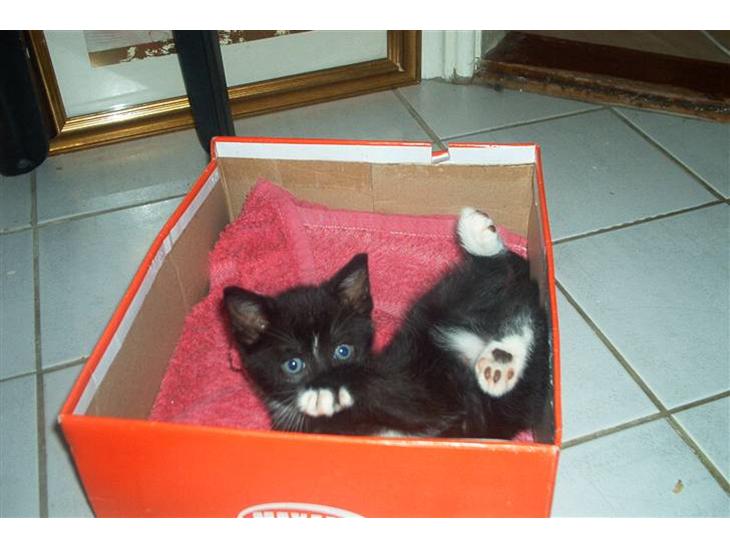 Jeg er sort med hvide aftegninger på poter og en lille hvid stiber langs snuden, jeg er en rigtig bisse der elsker at gå efter fødderne på min mor.