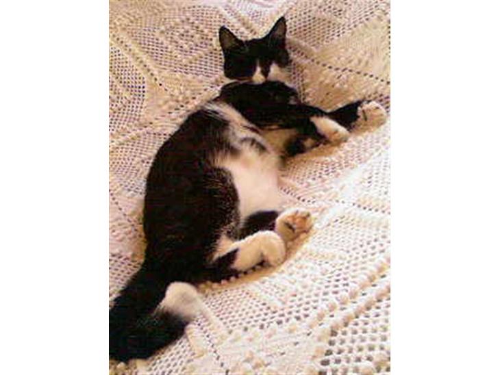Sort på ryggen, og i det øverste af hovedet. Maven er hvid med to sorte pletter, og halen er sort med hvid spids. Hun har hvide poter.