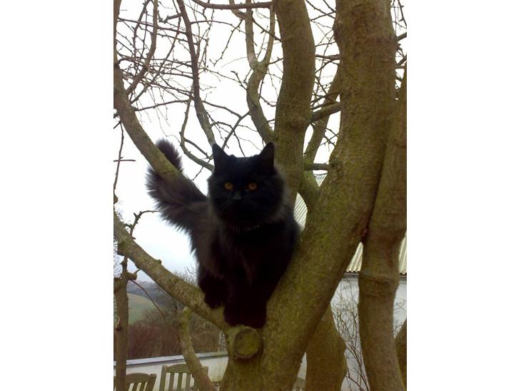 Dejlig lille mis. Hun er kælen og meget glad for at lege. Hun har de smukkeste gule øjne og en fin sort og blank pels. Hendes pels er lang, og hendes hale busket. og om vinteren har hun en løvemanke om hovedet.