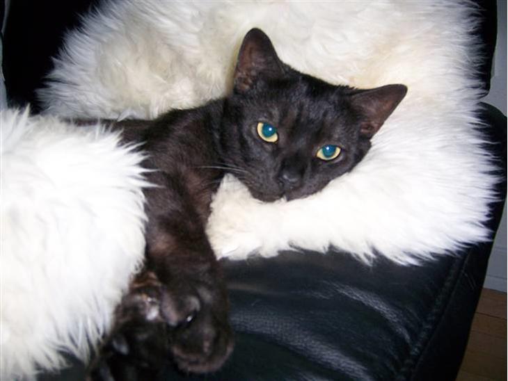 Romeo er spinkel af bygning, og så er han helt sort med brunt skær, men den nederste del af pelsen er hvid og det samme er hans hud.. Og så har han et lille knæk på halen, men vi ved ikke hvordan han har fået det, da vi fik ham da han var omkring 1½ år fra Kattens Værn..