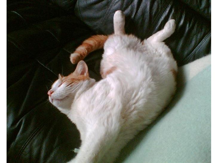 Da vi fik den var den 12 uger som killing. den var en værksteds kat på min fars arbejde. Den faldt ned fra flere meters højde og det var heldigt den overlevede, det er derfor den er skør i dag, men den er somme tider god underholdning. heh. Den kan godt angribe mig engang i mellem, det er fordi den for sådan nogle anfald, men så skal man bare berolige den og snakke den til ro. den er skør, men den er nu sød nok.