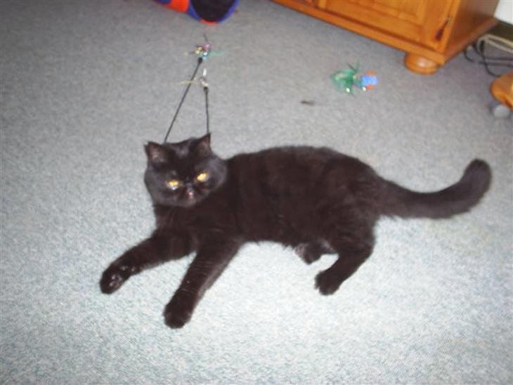 han er en maget rolig kat som elsker og lege og løbe efter den mindeste kat vi har han slosser nogen gange med felix :) ellers er han en dejlig kat maget kælen og sover med hoved næsten helt nede i vandskålen for han elsker vand hehe :)