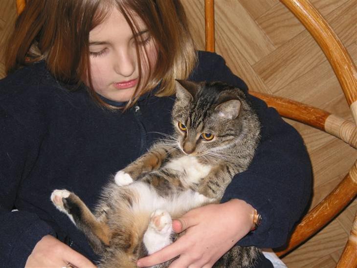 Vi har købt Fenja på et kattehjem, de havde fanget hende i Kolding, hvor hun løb rundt for sig selv. Men på trods af det er hun en meget kælen kat.