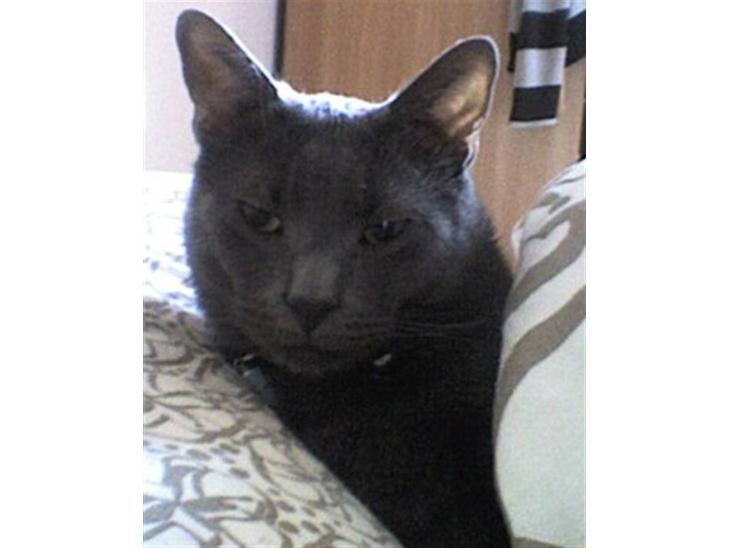 Minder mest om en 7kg Russian Blue, med et par hvide hår på brystet.