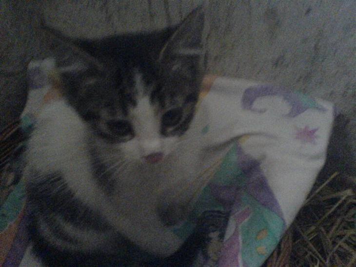 Hun er fundet i en hæk med sine søskede og mor. Hvor de var 7 uger. De blev af nogen og afleveret til dyrelægen. Til aflivning. En vi kender havde ringet og spurgt om vi manglede katte og det gjorde vi og sagde ja. Hun er nu ca 10 uger hun er blevet hentet i dag den 21 juli 08. Hun skal værer stald kat men bor nu hun i en boks.