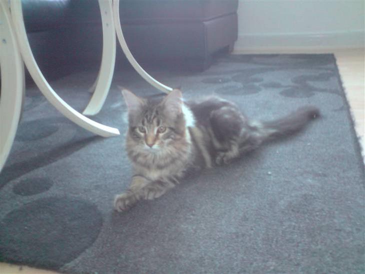 Stor Maine Coon killing, sort blotched tabby. hun har en dejlig blød pels, men en stor hale og fine tufser på ørerne :)