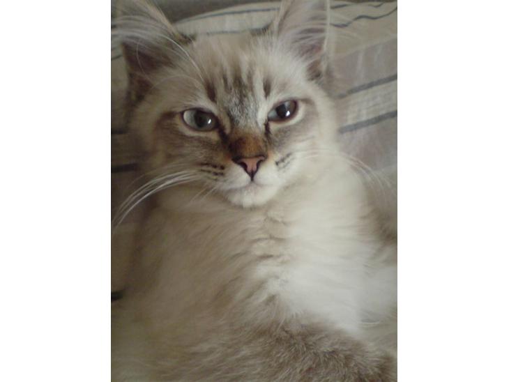 Ingen. Men hans mor er en Blå masket Hellig Birma og faren er en tappy rød/brun Hellig Birma.