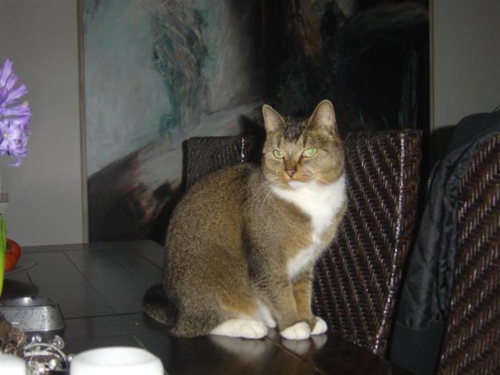 Babis - oprindelig vildkat. Var oprindelig en del af en familie på ca. 7 mere eller mindre vilde katte der boede hos genboen. Babis stak heldigvis af, da kattefangeren ellers også havde taget hende, og havnede i mine forældres brændestak. Mine forældre ringede til Mette Dyregod og 5 min efter stod jeg der med en transportkasse.