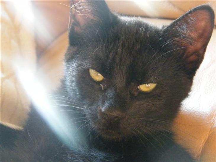 hun er rigtig flot, med de gule øjne, hun har en hvid 'plet' på brystet/halsen, hun er kommet fra en gård, og det kan man se! når man kaster en af hendes legetøjs mus, henad gulvet, så fare hun efter den, og leger med den, flere minutter efter...