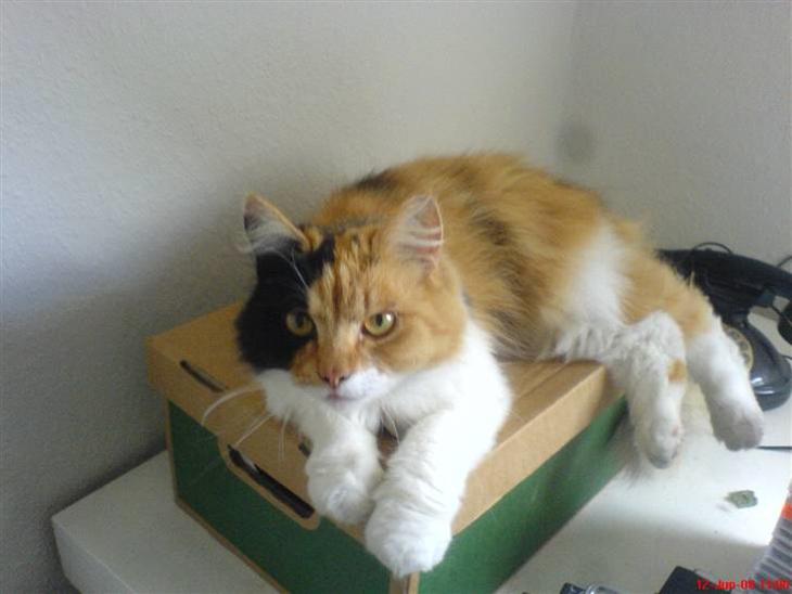 Hun kom til min kærestes hus da hun var en lille killing helt af sig selv.. Så der er ikke helt tal på hvor gammel hun er, men hun kom i 2005, så hun er nok en 4 år gammel..:)
