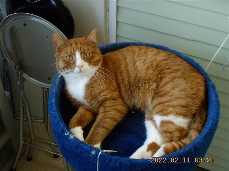 orange med hvide poter og blits. han elsker at drikke vand fra hanen :)