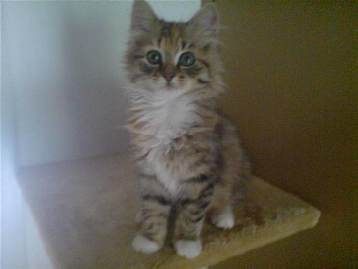 Fiona har lang, blød pels. Vi tror, at der kan være noget skovkat i hende (uden at have nogen forstand på det), moren er almindelig huskat og faren/fædrene kendes ikke.. Hun kan godt være temmelig fræk og provokerende og har indtil videre kostet os en del planter og andet nips.. Fiona elsker kurve og papkasser, som hun enten putter eller gemmer sig i.