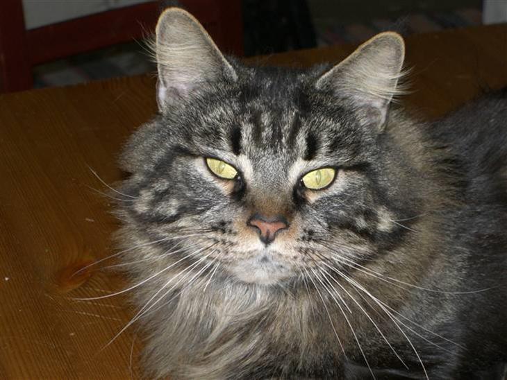 en stor kærlig bamse, som sjældent bliver sur. Han elsker at ligge og flyde på bordet, især hvis der sidder nogle omkring det og nusser ham.