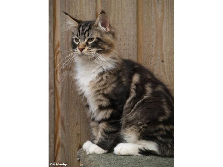 Er helt fantastisk lille kat med en KÆMPE personlighed. Han er uden frygt for noget eller nogen som helst og elsker livet som kat. Han jager ALT hvad jages kan, og sommetider ikke kan:o)