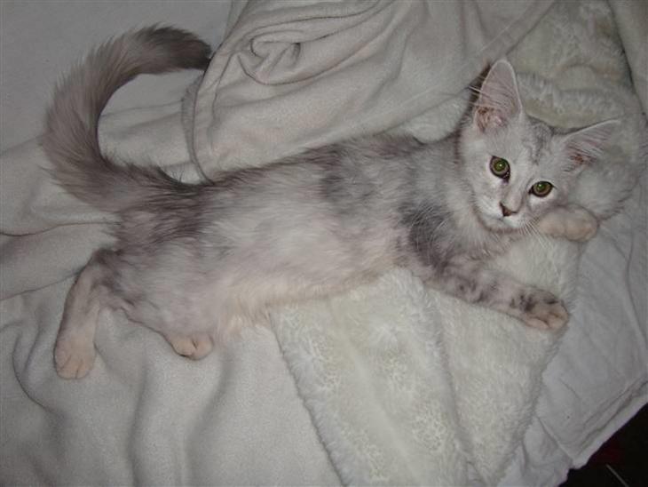 Kælen, elsker at putte ind til en i sofaen. Leger gerne med hvad der nu måtte være i nærheden, helst med store spring. Er ekspert i at sprede kattegrus ud i hele huset