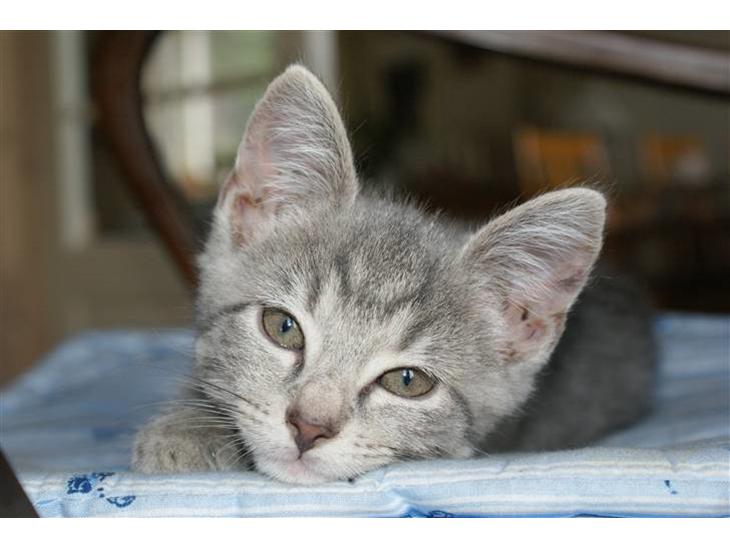Hun var ca. 5 uger da hun kom ind til os. Jeg gav hende mad, og heldigvis kunne hun selv spise ! Og 1½ måned efter er hun som enhver anden lille killing. Hun er selvfølgelig meget knyttet til mennesker, men hun har det godt - som selvfølgelig er det vigtigste.