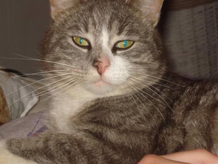 Oscar er en gråstribet kat, med hvide poter og mave.