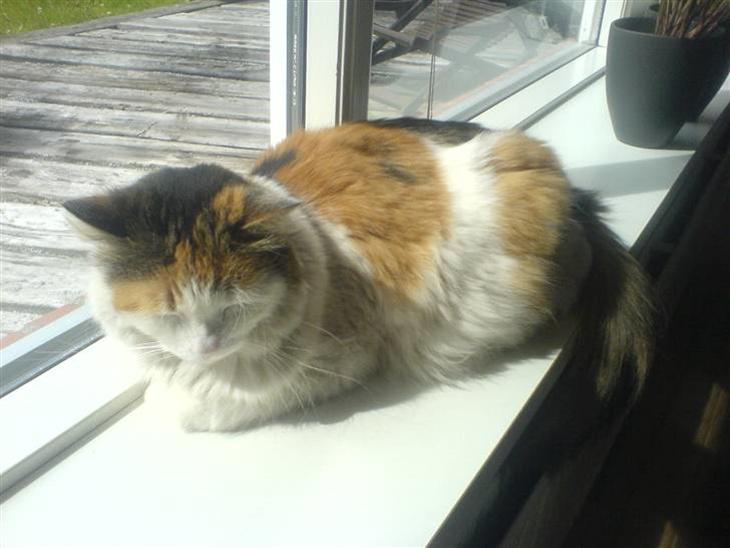 Luske er en 3'farvet hunkat ( hvid, rød og brun ) ''halen er grå''