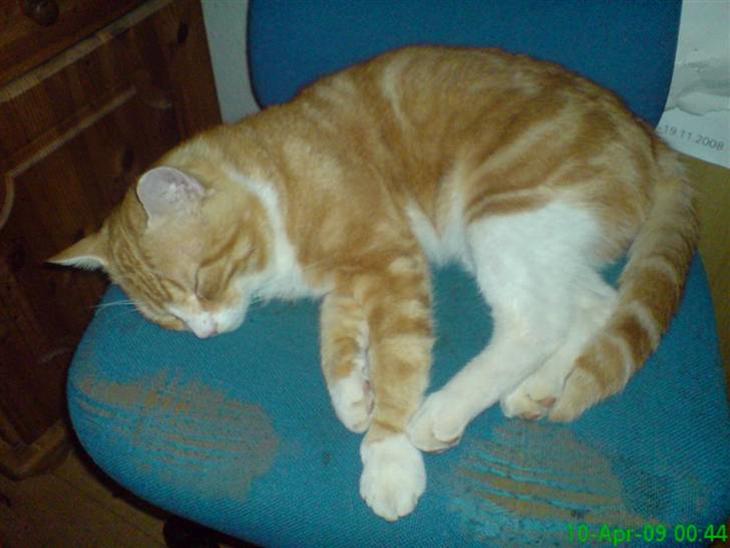 hjemme er han er meget doven kat han ligger også ned når han spiser og når han har lagt sig i sofaen flytter han sig ikke før han skul ud i køkkenet og ha noget og spise