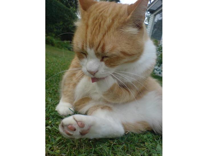 Han er en lille darlig, han elsker at blive kløet på maven og blive kløet på ryggen hvor han ikke selv kan vaske sig pga. usmidighed og overvægt, så der skal han rengøres.
