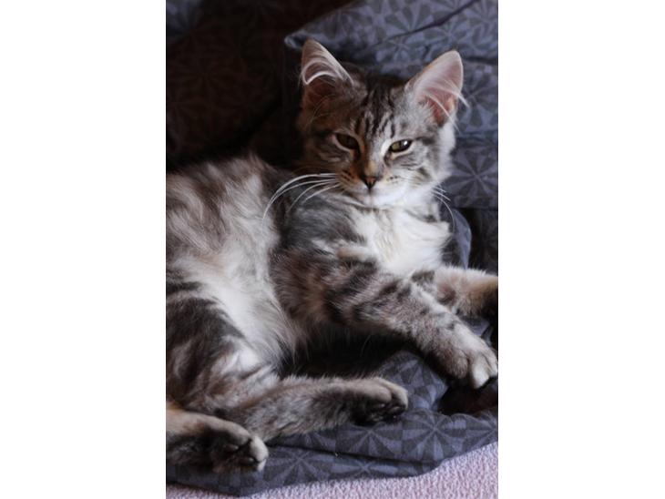 Ingen -Hovedsageligt Main Coon, der er blandet en Tyrkiks Van ind i billedet, så hendes pels er lidt mere silkeagtig end hendes brormand, Frede.