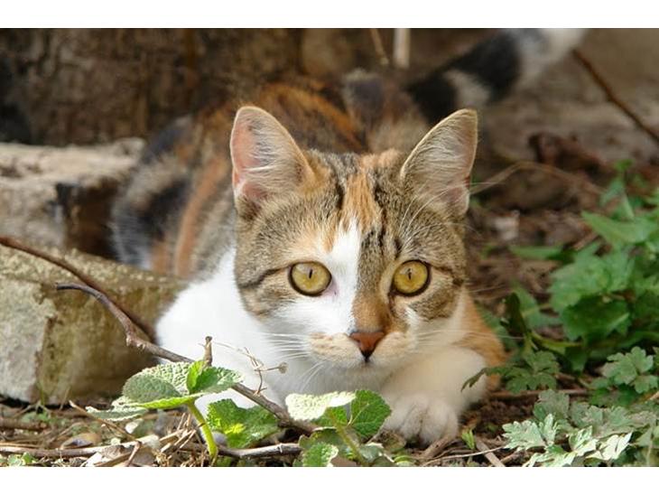 Hun er meget forsigtigt i de nye omgivelser, men har allerede flittigt spist og brugt kattebakken.