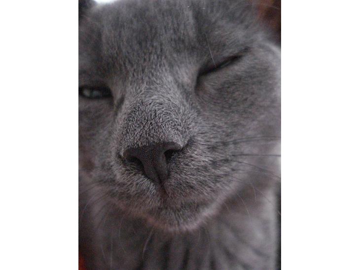 Helt grå, meget smuk og tyk pels. flotte øjne. drikker vand fra hanen på badeværelset hver morgen. snakker når man spørg hende om noget, kan ikke lide at være alene.