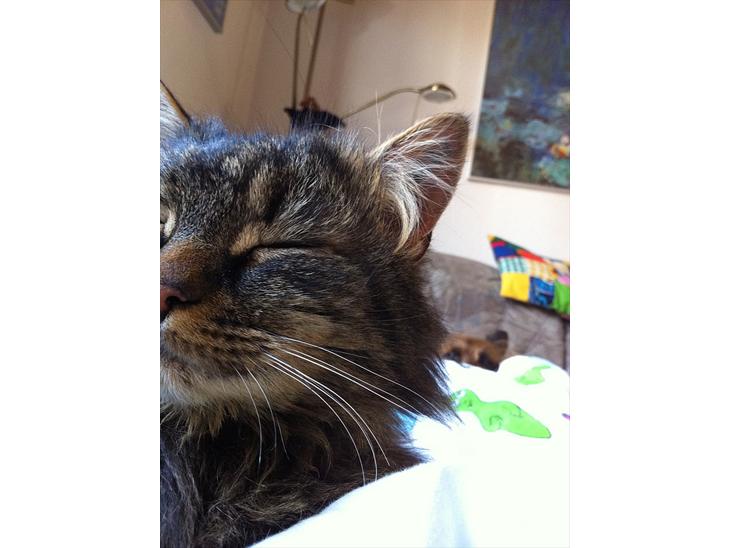 MEGET ROLIG. når han skal have mad skal han altid have en lur på halvejen. det eneste tidspunkt han er frisk er når der er fremmed katte.