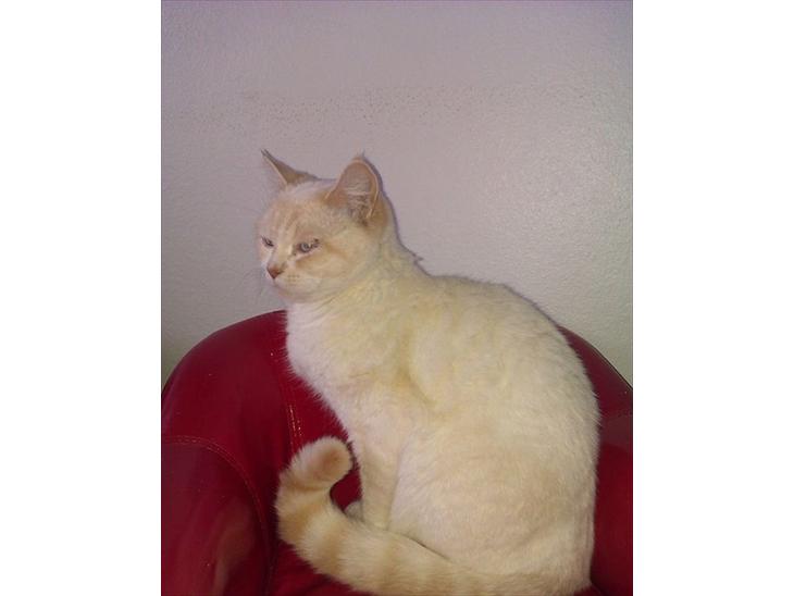 Creme-hvid, med rødligt skær og med de smukkeste isblå øjne.