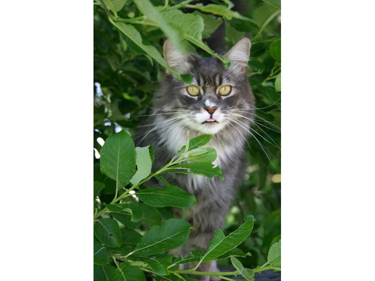 En stor og robust hankat på ca, 7 kg. Han er nu 2,5 år gammel. Han er en dejlig mørk grå silver tabby og er en stor hårbolt. Han ved hvem der bestemmer derhjemme, og det er ham selv.