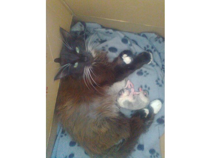 vi var så heldige at få lille pjuske her for 4 md siden, af vores nabo der stod og skulle flytte. vi blev spurgt om vi ville have hende da hun ellers skulle aflives. det kunne vi slet ikke stå for. hun er en super dejlig og kælen pige. hun laver sådan nogle sjove spjæt med bagbenene når hun kommer og vil ligge på skødet. hun har en sjov mani med at gå på badeværelset og tisse i afløbet, men gør dog stort på bakken :o) hun har ikke fået killinger før, ikke hvad vi ved af. men her d 21.6 kom der så 4 søde af slagsen.