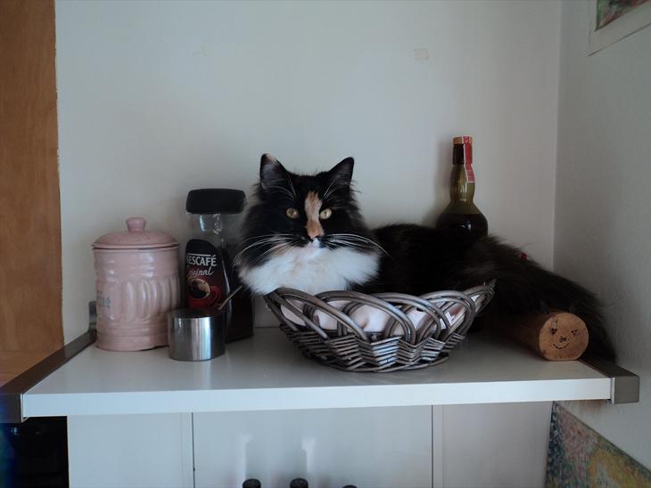 Opfører sig som Dronningen af Saba, hvilket i mine øjne er fuldstændig berettiget. Er hele husets kælepotte og ligger gladeligt midt på køkkengulvet med maven fuldstændig blottet og forventer at alle stopper op og beundrer hende.