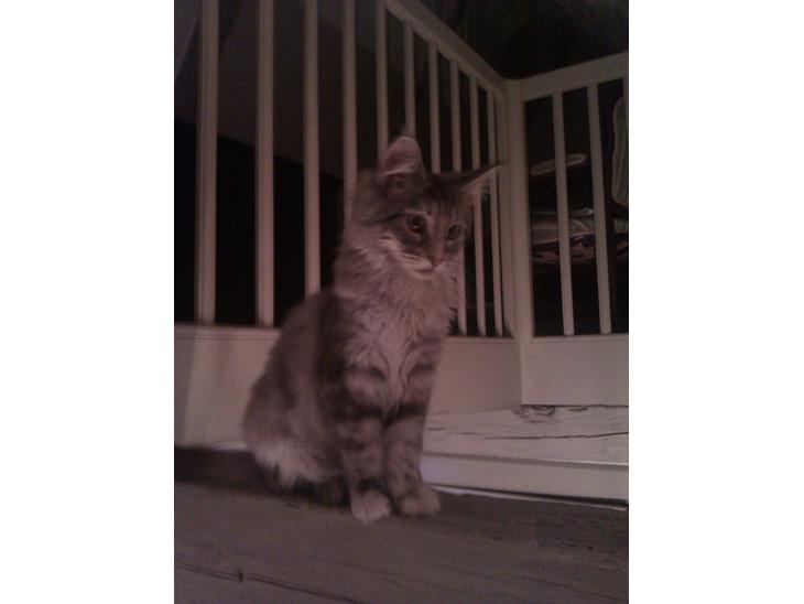 Hun er en dejlig Maine Coon killing som har de smukkeste farver: sort, tortie, silver. Mønster: blotched tabby.