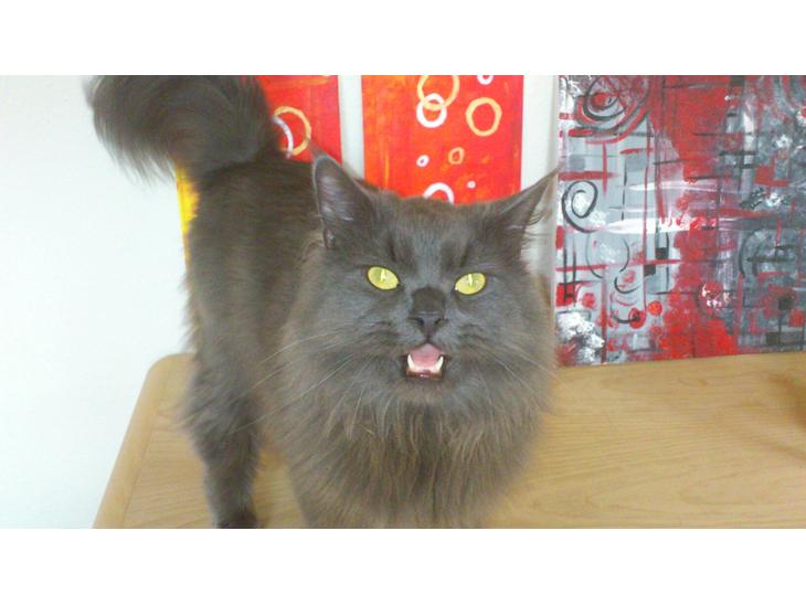 Helt grå, lang pels, stor busket hale, "snesko", altså pelstotter mellem trædepuderne og små totter på ørerne.