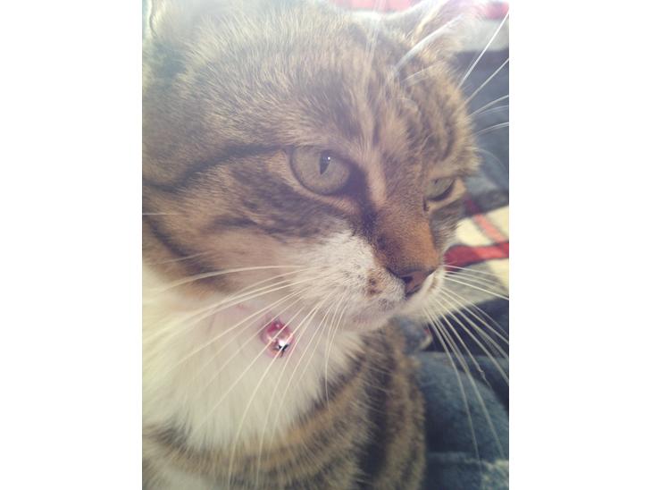 Hun er en meget dejlig kat, som jeg fandt for nogle år siden, hun var syg og havde intet halsbånd og min nabo tog sig af vilde katte og jeg tog Smiley med til hende. Senere fandt vi ud af at hun var gravid. Smiley har altid været ret så genert men vi har et rigtigt godt forhold og hun stoler virkelig på mig. Smiley sover mere eller mindre hvor hun har lyst til, men hun foretrækker at sove lige bag ens nakke, når man selv sover. Hun er en smule tyk, men hun er stadig en meget skøn kat :)