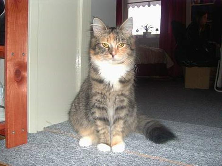 Hun er bare så dejlig, rolig og meget meget kælen, vil altid nusseres med.. Hun er grå, hvid, orange og sort.. hendes ene træde pote er lyserød og sort.. Og så er hun en smule tyk.. Da hun er pokkers mad glad, hun kan spise hele tiden, hvis hun får lov.. Har ikke så lange ben, måske endda lidt kort-benet, men det blir hun bare kønnere af..Er en smule forsigtig med det meste, skal gerne lige se tingene lidt an..