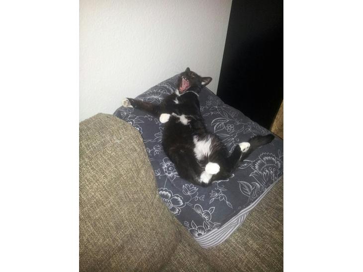 Den har hvide poter og hvid ned af brystkasse, resten er sort. Hun er en lille "Vildbasse", og har krudt i røven. Hun er en rigtig god morgenvækker, skriger og skraber på døren indtil man er stået op.
