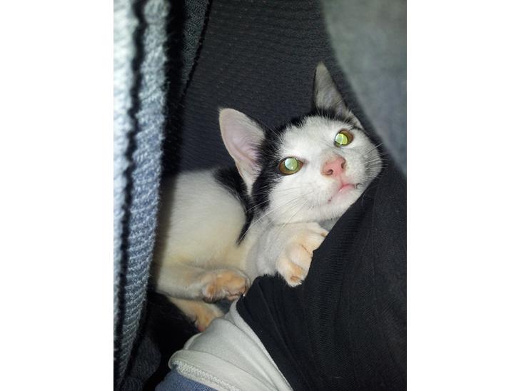 Han er hvid med sorte aftegninger, en rigtig skønhed.
