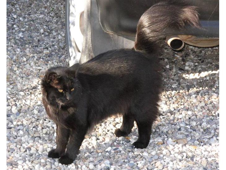 Han er helt sort og har FLOTTE brune øjne, (har aldrig set en kat med så smukke brune øjne) da han forsvandt havde han et hvidt halsbånd på, og i halsbåndet hang der en lille klokke.