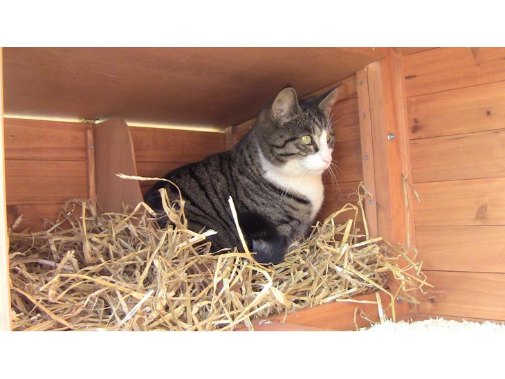 Meget rolig og sover meget. Efter vi fik høns er hun også blevet rimeligt glad for at rende rundt udenfor og lure på dem :)