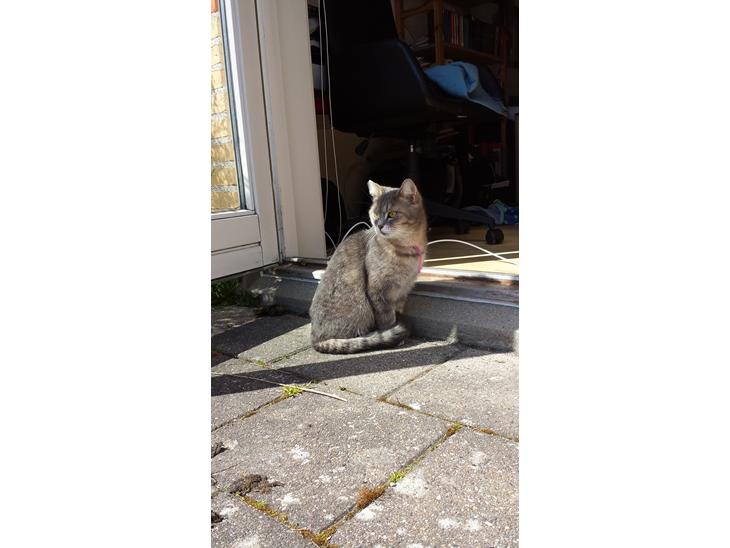 En dejlig blanding af russian blue, maine coon og perser. Hendes bug er lys med et par mørke pletter. Hun har også lyse markeringer i ansigtet. Ellers har hun en lidt udefinerbar blågråbrun alt efter hvordan lyset falder på hende. Hendes list mørkere tabbymønster kan næsten forsvinde i et bestemt lys. Hun har meget gule, runde, udtryksfulde øjne. Og så er hun polydactyl med 1 extra tå på hver pote.