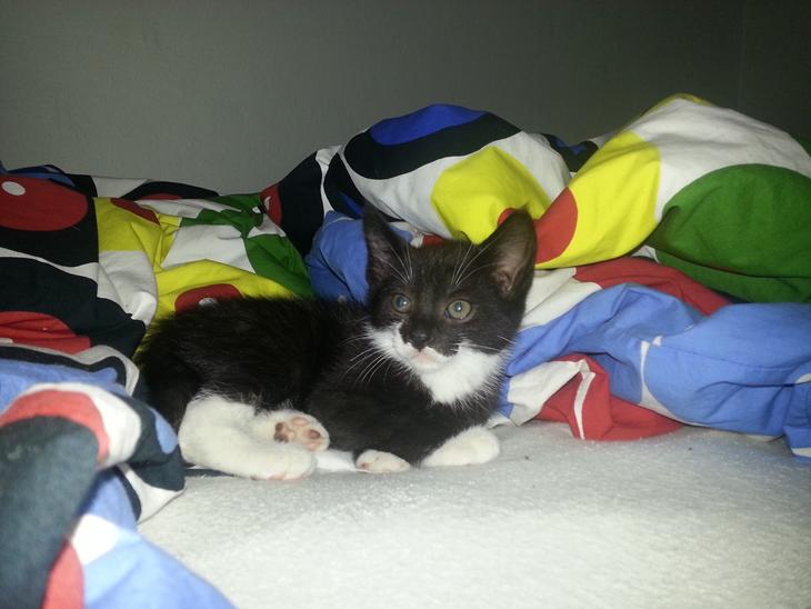 En næsten helt sort kat med hvide aftegninger på maven og lidt i hovedet. Han vil gerne på eventyr og se hvad verden har at byde på, men ellers er han meget stille og rolig.