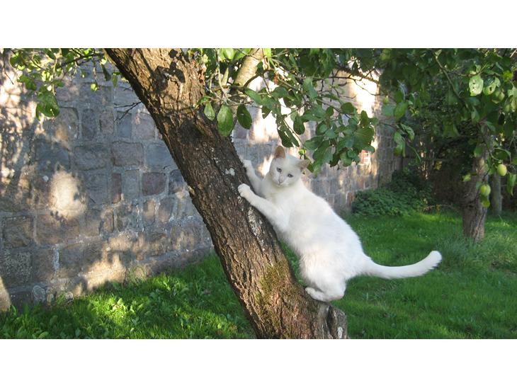 Hun er rigtig kælen og sød. Først da hun kom, sad hun bare i et hjørne, men nu klatrer hun rundt og er glad. Hun er frisk og godmodig.