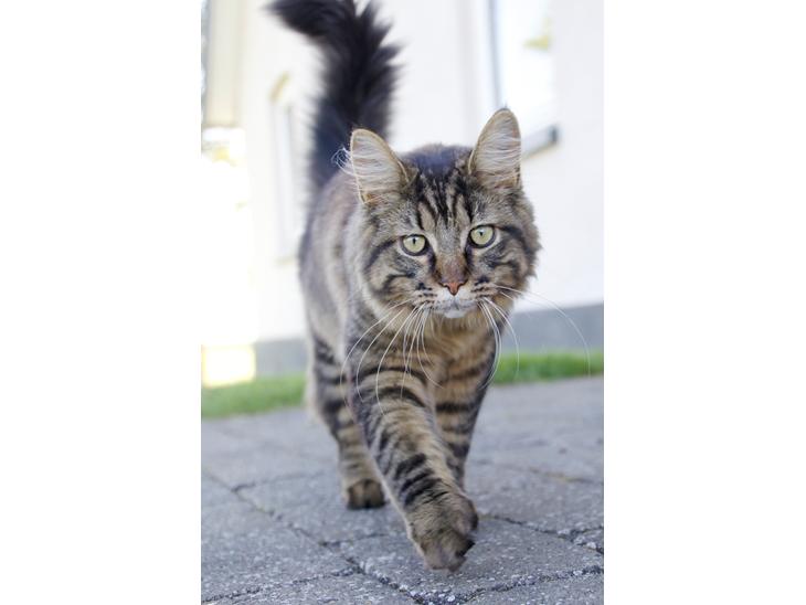 Mc er af racen Maine Coon, verdens største katterace. Så vi forventer at få en stor stor løve! Lige nu er han stadig en lille klump, men trods størrelsen er der masser af fut i ham! Han spænder fra den ende til den anden i sofaen på nul komma fem. Jeg har aldrig set en så tillidsfuld kat efter blot 3 dage man har ejet den. Om aften når han ligger på sin pude, ligger han og masserer min hovedbund og smager somme tider på mine øre. Han er virkelig en bandit! Han kommer allerede de fleste gange når man kalder, trods jeg kun har ejet ham i 5 dage nu.